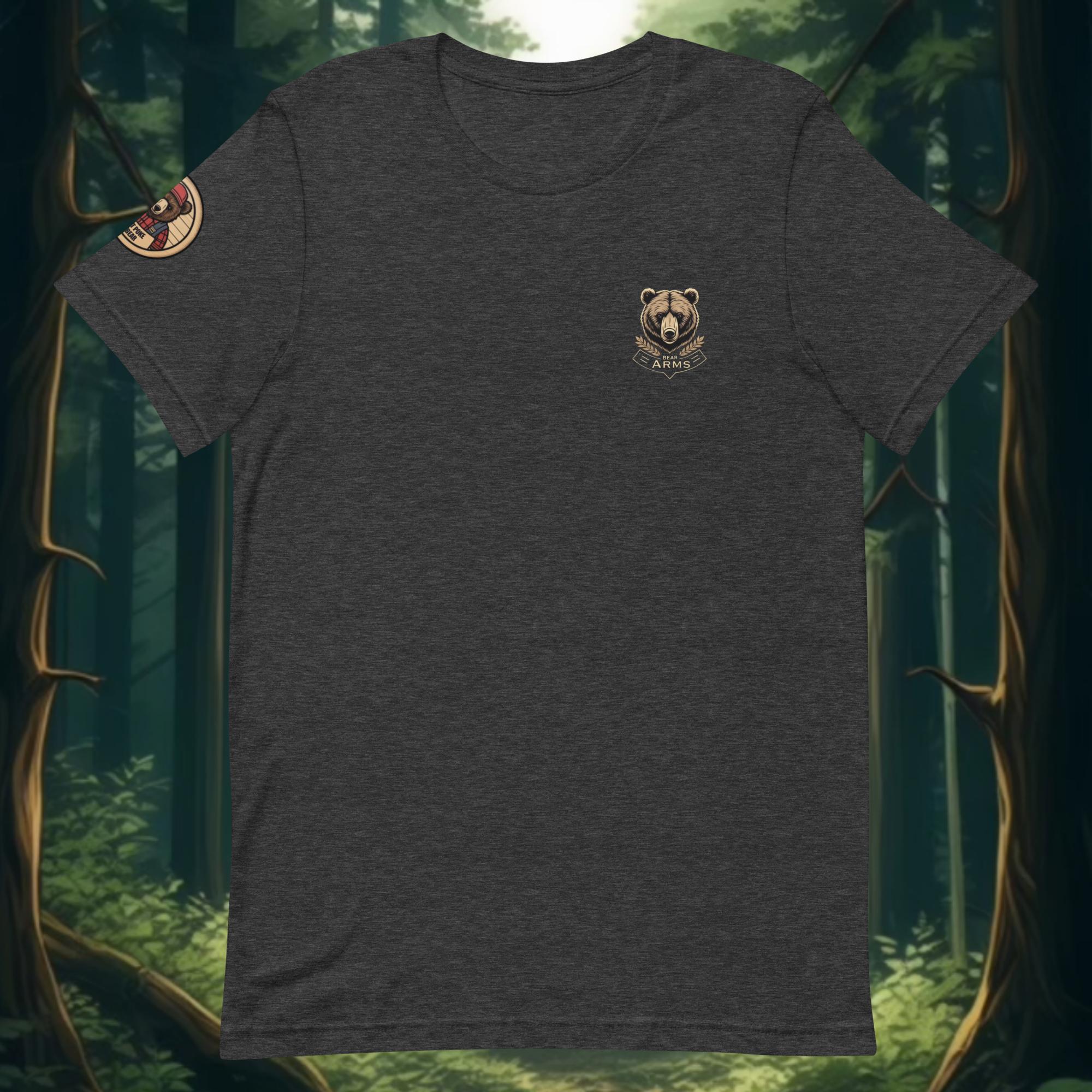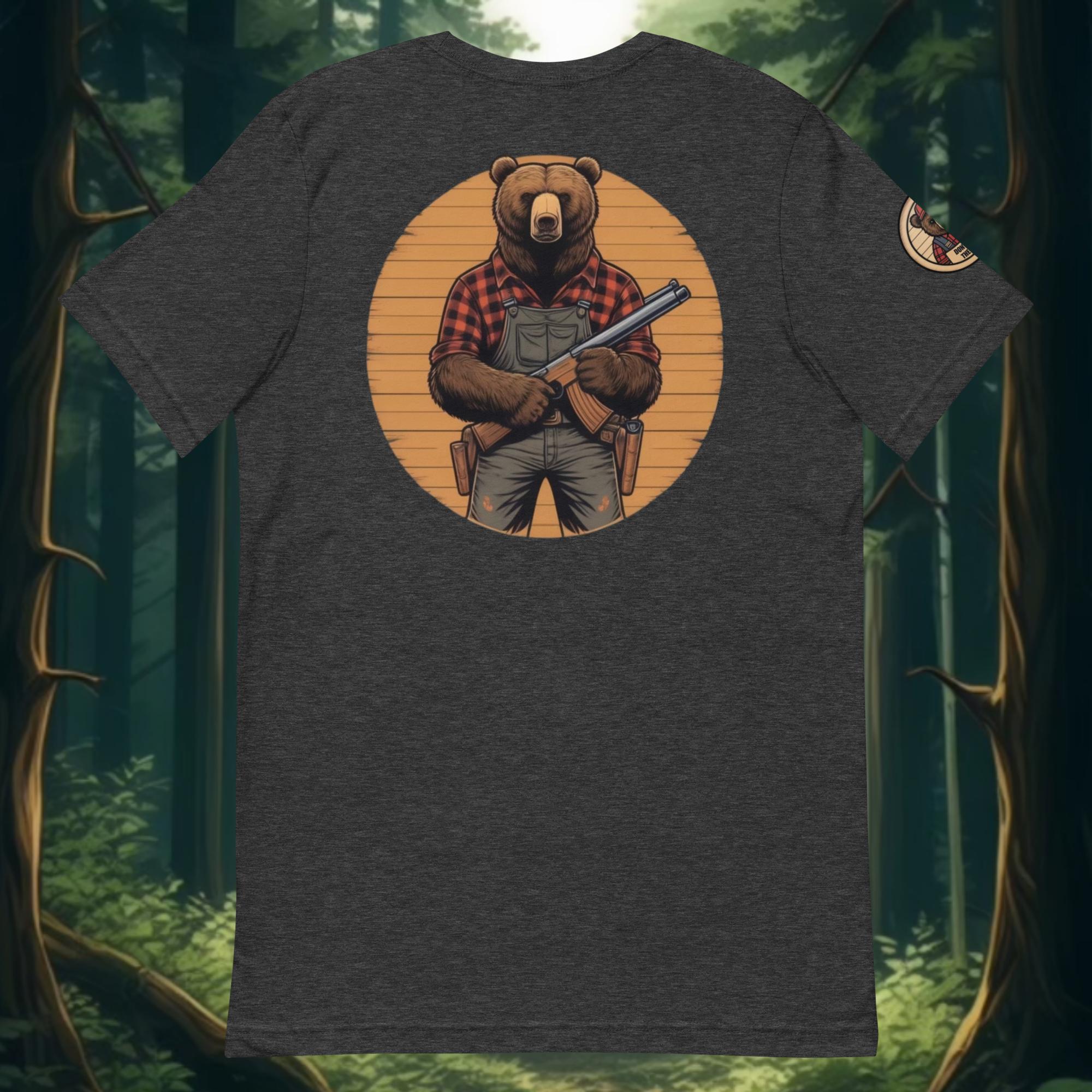 "Channel your inner lumberjack with this fierce T-shirt featuring a rugged bear wielding a powerful gun. Crafted from soft, breathable cotton, this tee blends comfort with style, making it perfect for outdoor adventures or casual outings. Embrace your wild side and make a statement with this unique design!"