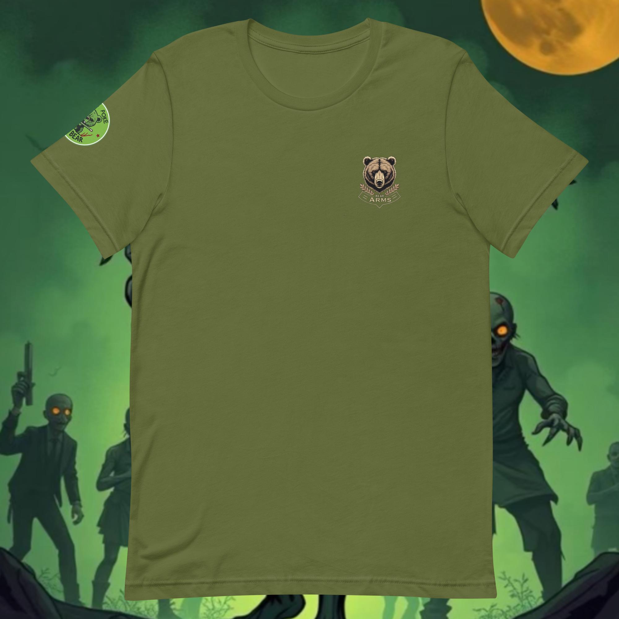 "Unleash your inner survivor with our 'Zombie' T-shirt. This design features a fierce, undead bear gripping a powerful firearm, ready to take on the apocalypse. With hauntingly detailed artwork, this tee combines the raw power of nature with a rugged, zombie twist. Perfect for those who aren't afraid to stand their ground and make a statement. Crafted from soft, durable fabric, this shirt is as comfortable as it is eye-catching. Show off your support for the Second Amendment with a style that's truly killer."