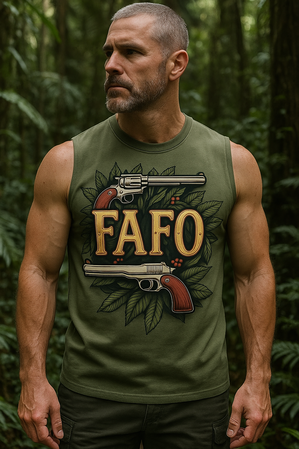 Built for the wild and worn by the bold, the Bushman (FAFO) muscle shirt is made for those who thrive off-grid and don’t take kindly to nonsense. Featuring a rugged outdoor graphic with “FAFO” front and center, this shirt speaks fluent country grit. Whether you’re tracking game, stacking wood, or just making a statement—this sleeveless beast keeps you cool and sends a clear message: Respect is earned, and trespassers beware