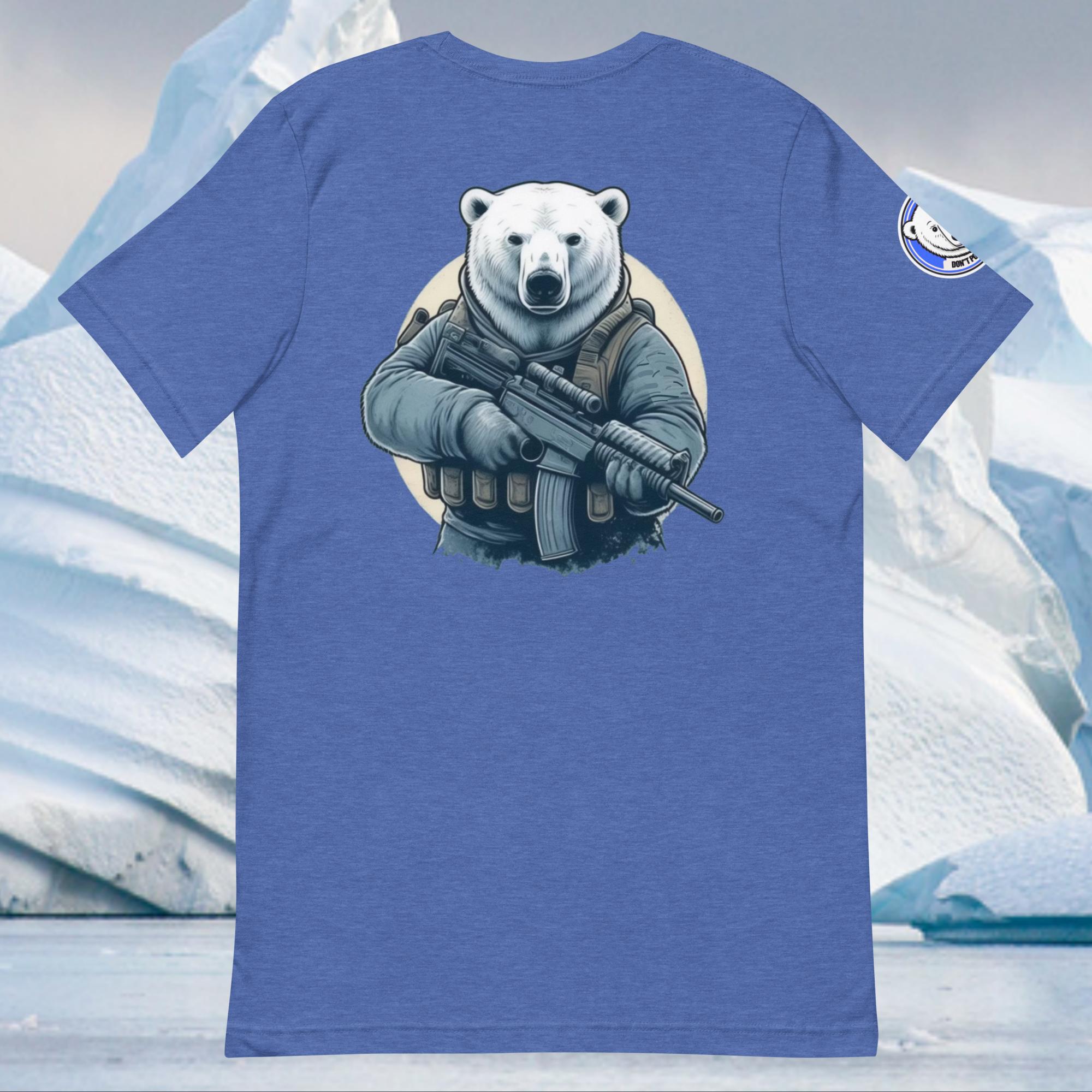 "Arctic Patrol: Where the Cold Meets Courage." Featuring a majestic polar bear, poised and powerful, holding a symbol of protection in its paw. Brave the chill with this fierce guardian of the ice.